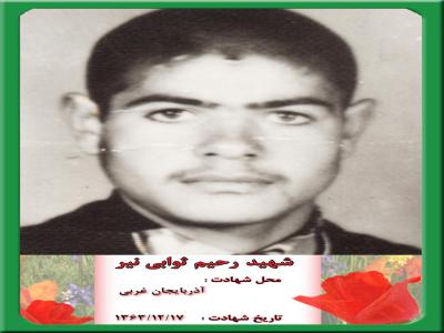 شهيد رحيم صوابي درسال 1343درخانواده اي مذهبي در بخش نير بدنيا آمد ودرسن شش سالگي علاوه برکمک درکارهاي کشاورزي به پدرش شروع به تحصيل کرد شهيد نامبرده درسال 1362 با دختر عموي خود ازدواج نمود وجهت کار به تهران رفت و در همين وقت بود که حمله هوايي به شهرها بيشتر شده بود خلاصه رحيم بعد از چند ماه کارکردن به نير بازگشت وبعداز مدتي دفترچه آماده به خدمت گرفت وعازم خدمت مقدس سربازي شد که پس از ده روز که ازمدت سربازي مي گذشت شهيد صاحب دختر شد و بنا به سفارش قبلي خودش نامش را فاطمه گذاشتند وبعد از اتمام دوره آموزشي در پادگان پيرانشهر به اسلام ناب محمدي(ص) خدمت مي کرد در طول خدمت چندين با ر به مرخصي آمد و مرخصي آخري که آمده بود با ساير مرخصي هايش کاملاً فرق مي کرد رحيم ديگر رحيم قبلي نبود به طوري که موقع رفتن از همه دوستان وآشنايان حلاليت مي طلبيد وبا همسرش در مورد شهادت صحبت مي کرد او در حالي که زير لبش زمزمه شهادت را ميکرد به مادرش مي گفت که اگر به خاطر اسلام نبود به خدا هيچ وقت دور نمي شدم از کنارتان چه کنم که اسلام در خطر است و اگر دراين راه با عزت خون ندهيم دشمن از ما به ذلت خون مي گيرد مادر اگر خبر شهادت مرا شنيدي سجده شکر به جا آور و بگو خدايا راضيم به رضاي تو وتسليمم به امر تو ، بنا براين مادرش موقع اداي نماز عصر خبر شهادت رحيم را با چندين شهيد ديگرکه از تلويزيون پخش مي شد مي شنود .